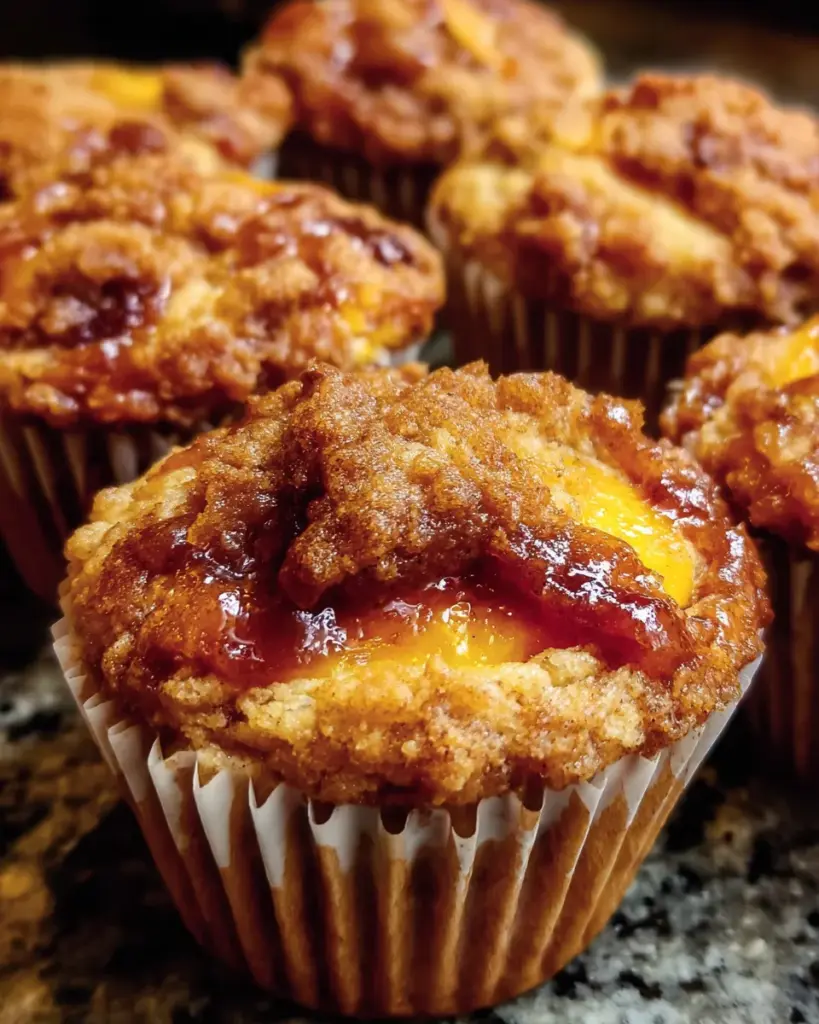 Delicious jumbo muffins filled with caramelized peaches, perfect for breakfast or dessert.