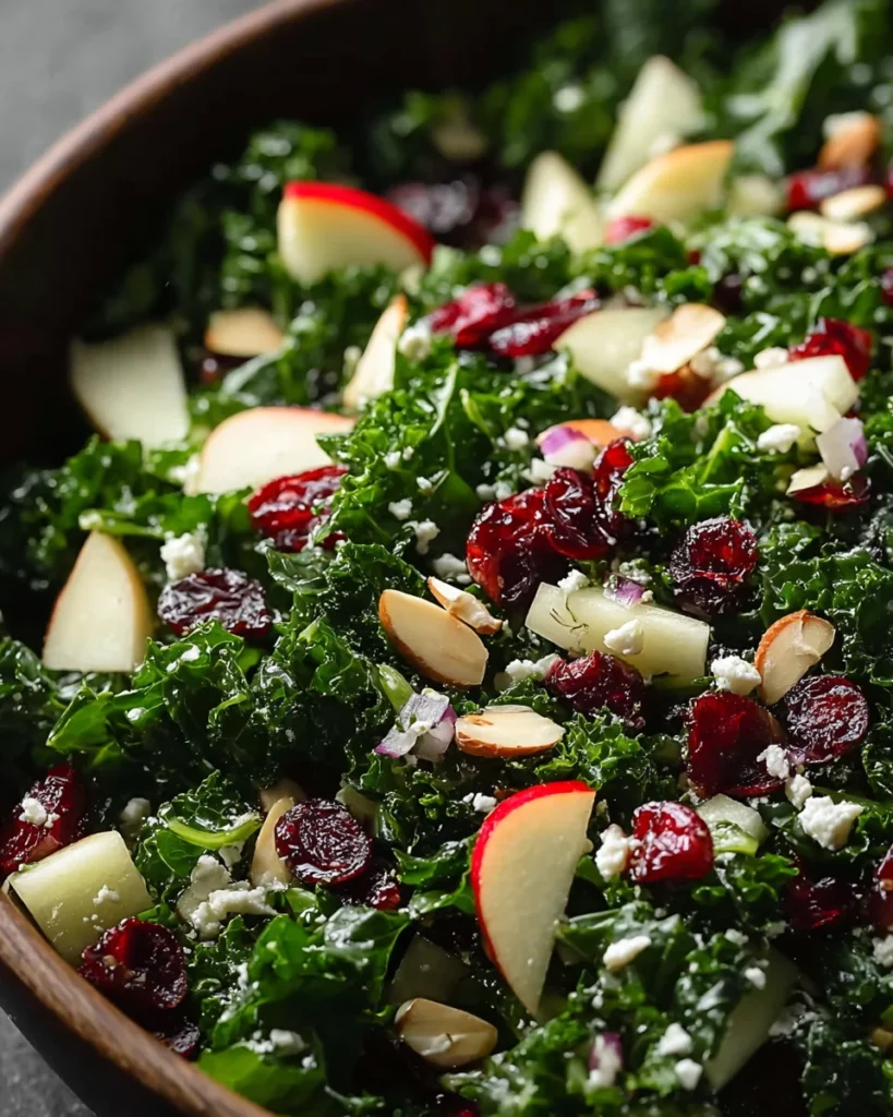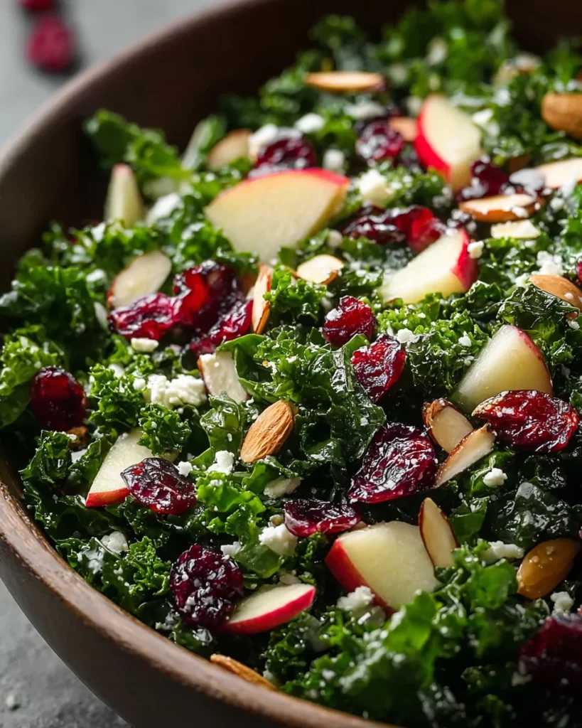 A vibrant and nutritious kale salad featuring dried cranberries, sliced almonds, and feta cheese, perfect for a refreshing meal or side dish.