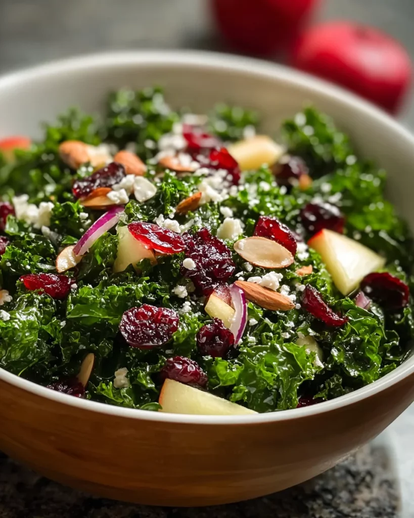 A vibrant and nutritious kale salad featuring dried cranberries, sliced almonds, and feta cheese, perfect for a refreshing meal or side dish.