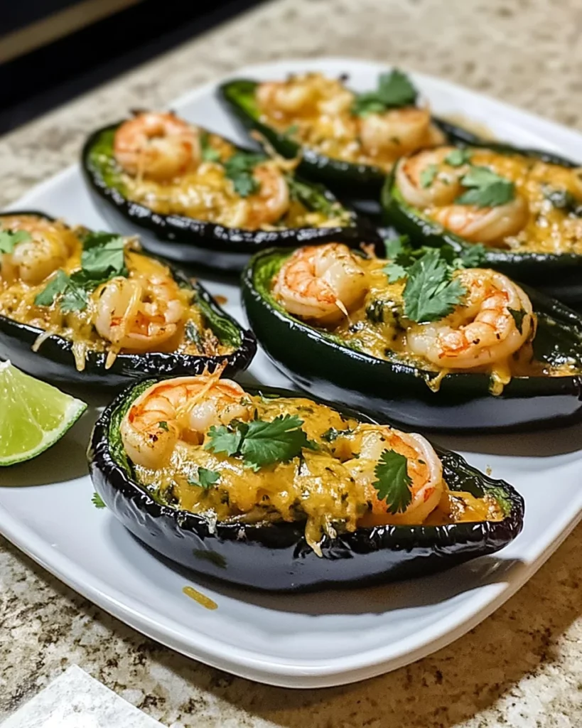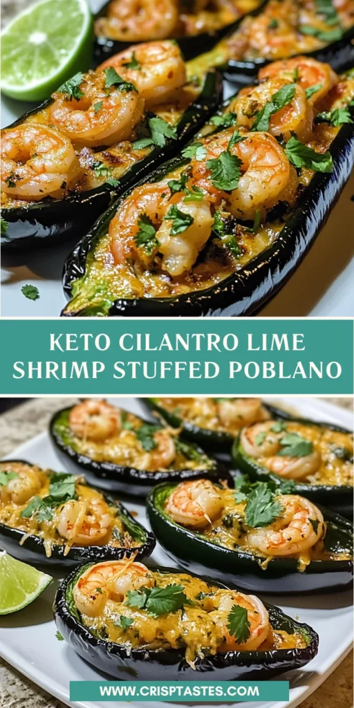 A delicious keto-friendly dish featuring poblano peppers stuffed with shrimp, cream cheese, and cilantro lime flavors.