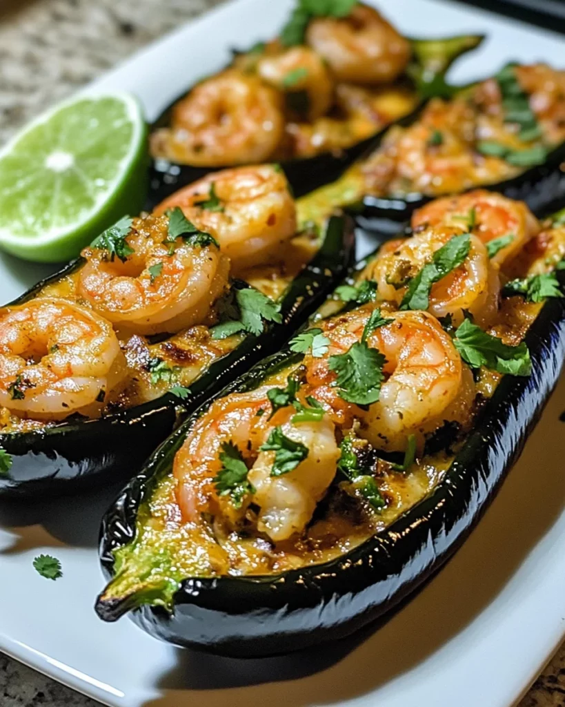 A delicious keto-friendly dish featuring poblano peppers stuffed with shrimp, cream cheese, and cilantro lime flavors.