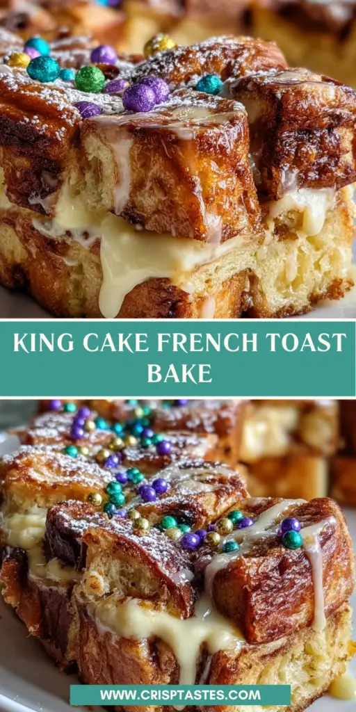 Creating this King Cake French Toast Bake not only fills your kitchen with delightful aromas but also brings happiness to the breakfast table. Each layer tells a story, from the soft brioche to the creamy custard, inviting smiles and encouraging sharing. Whether it’s a special occasion or just a weekend treat, this dish transforms an ordinary morning into a festive celebration. So gather your loved ones, savor every delicious bite, and embrace the joy that comes with cooking. Trust me, moments spent enjoying this creation will lead to cherished memories that last far beyond the breakfast hour!