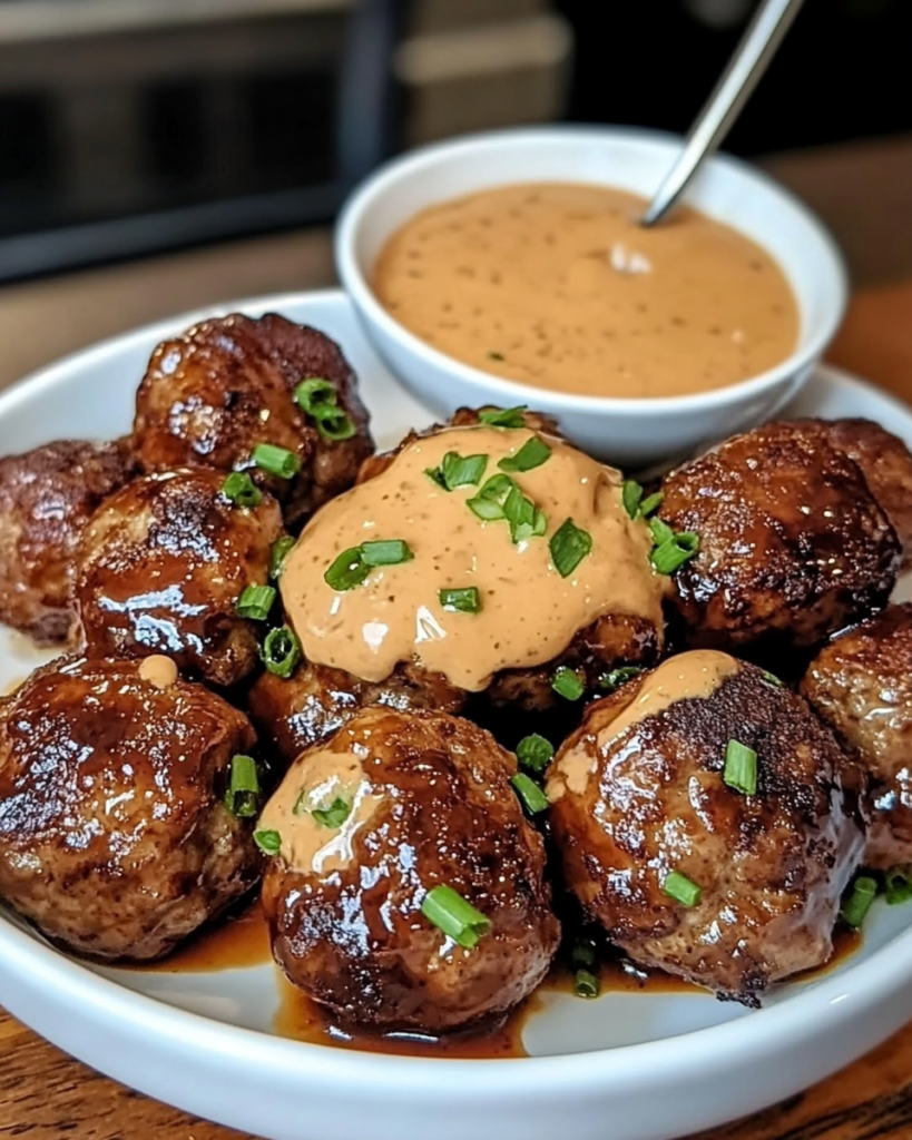 Korean BBQ Meatballs with Spicy Mayo are a delightful fusion of savory and sweet flavors, enhanced by a creamy and spicy dip.