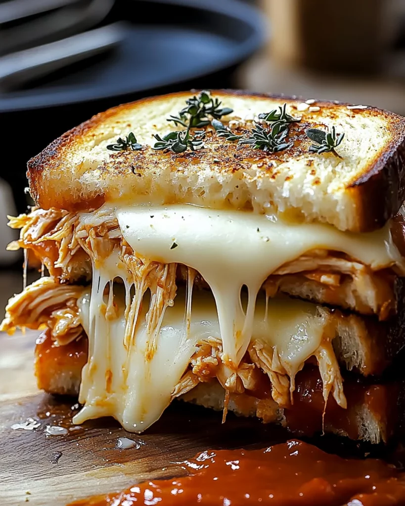 - Place one slice of bread (buttered side down) in the skillet. Add a slice of mozzarella cheese, a layer of shredded chicken, a spoonful of marinara sauce, and another slice of mozzarella cheese.