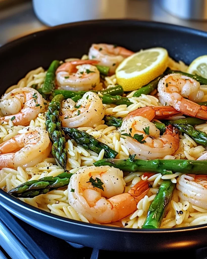 A delightful dish featuring succulent shrimp and crisp asparagus tossed with orzo pasta in a lemon garlic sauce.