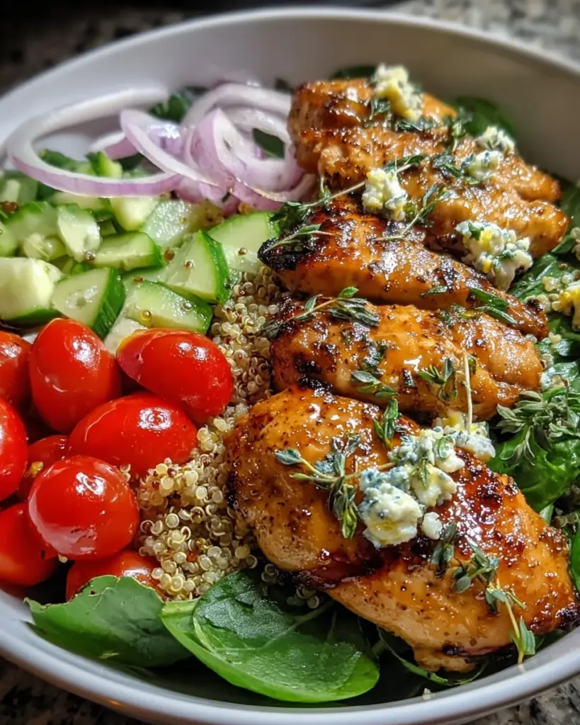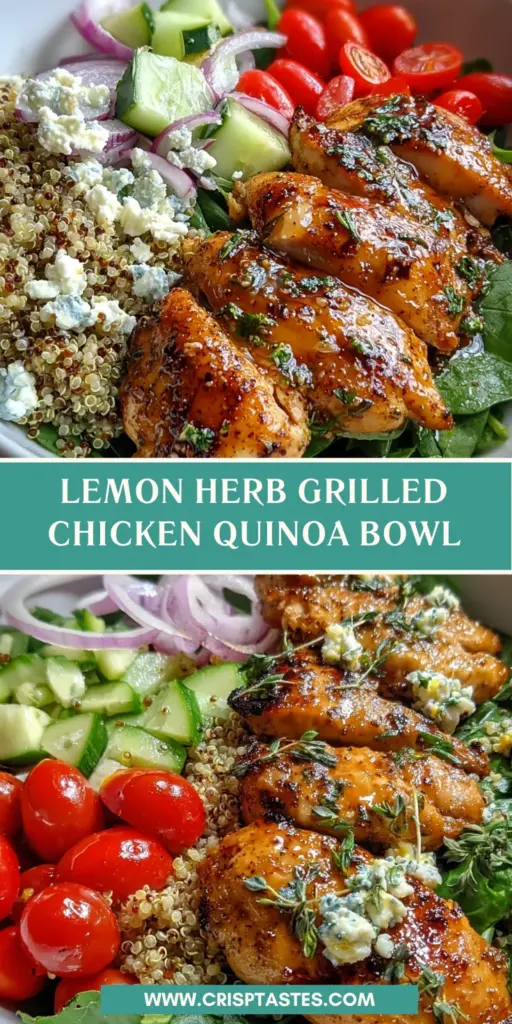 A delicious and healthy Lemon Herb Grilled Chicken Quinoa Bowl filled with vibrant vegetables and a zesty dressing.