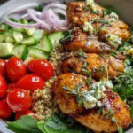 A delicious and healthy Lemon Herb Grilled Chicken Quinoa Bowl filled with vibrant vegetables and a zesty dressing.