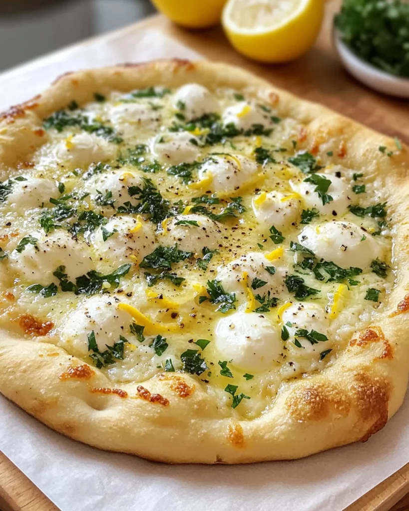 A delightful lemon-flavored pizza that adds a zesty twist to the classic pie.