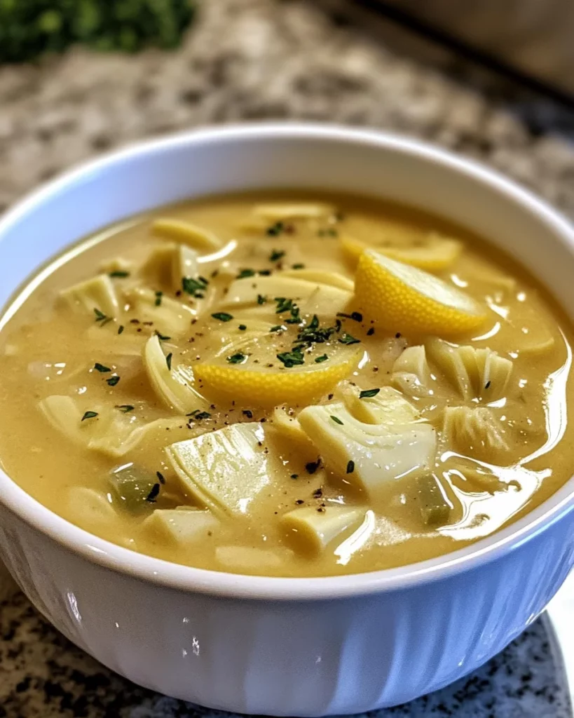 A creamy and flavorful lemony artichoke soup that is perfect for a comforting meal.