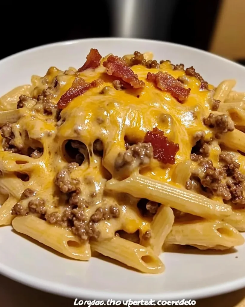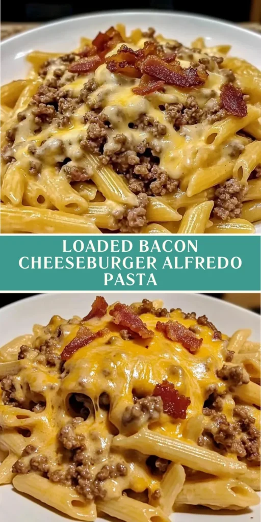 Keywords: cheeseburger pasta, bacon alfredo, creamy pasta, beef pasta, comfort food