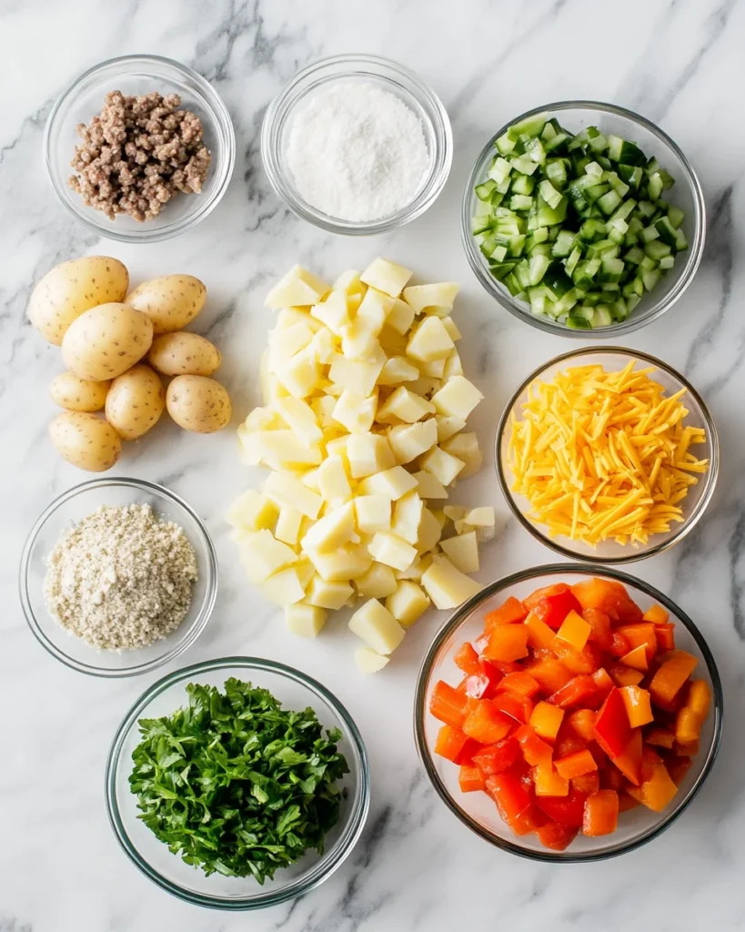 - Prep the ingredients by washing and dicing the potatoes, bell peppers, and onions.