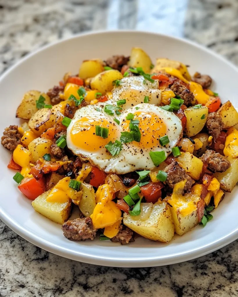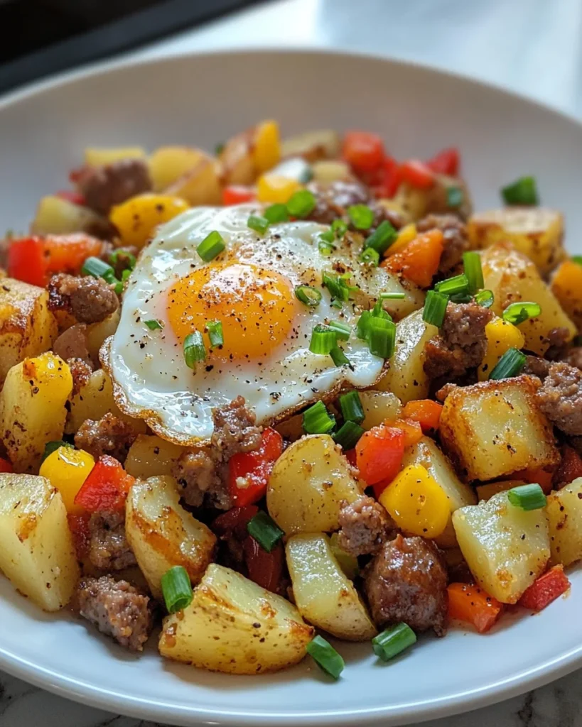 A flavorful and customizable Loaded Breakfast Skillet recipe featuring crispy potatoes, savory sausage, and perfectly cooked eggs.