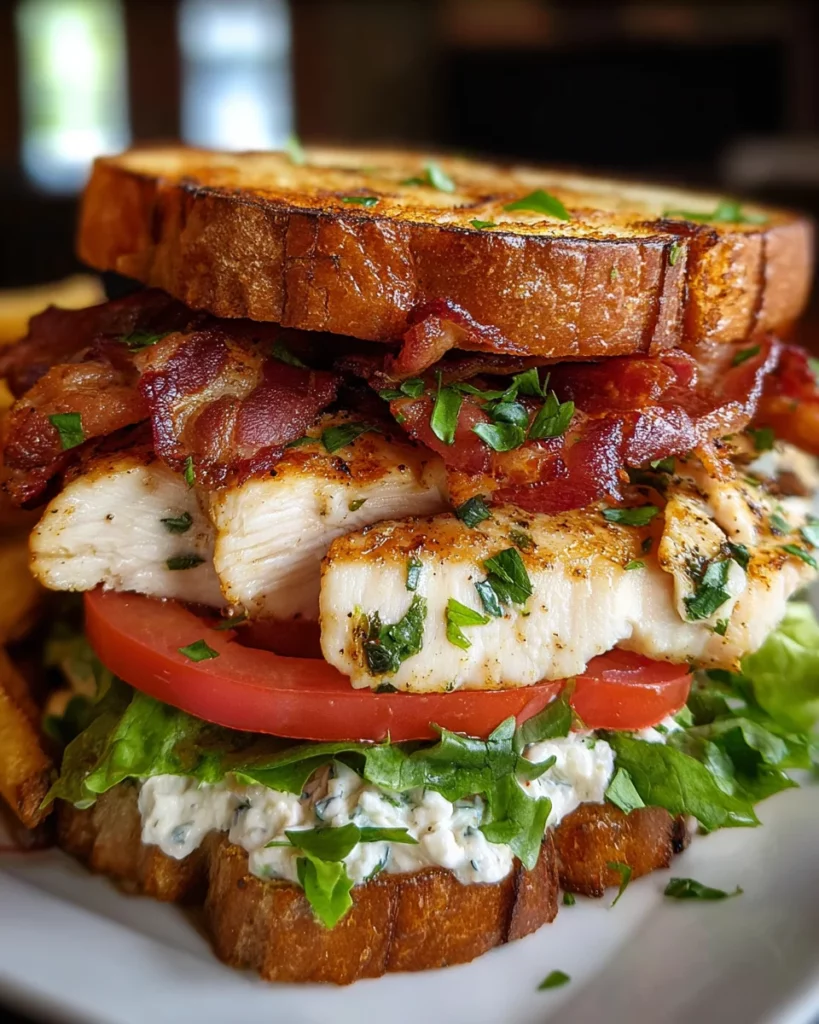 - Spread the herb mayo on one side of each bread slice. Layer the bottom slice with lettuce, tomato slices, sliced chicken, and crispy bacon. Top with the second bread slice and serve immediately.