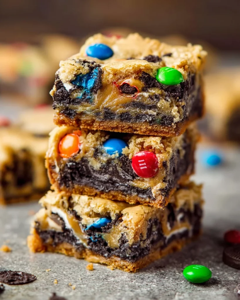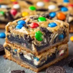 Delicious dessert bars made with Oreo cookies and M&M’s for a delightful treat.