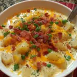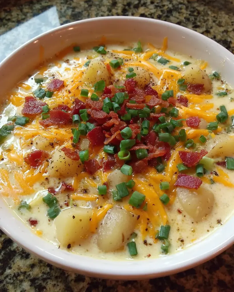 A creamy and comforting loaded potato cheese soup featuring savory bacon, rich cheese, and tender potatoes.