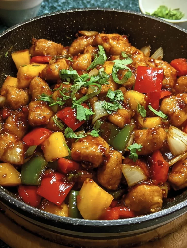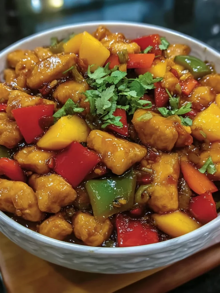 A flavorful and quick meal combining tender chicken with sweet mangoes and vibrant vegetables, all stir-fried together.