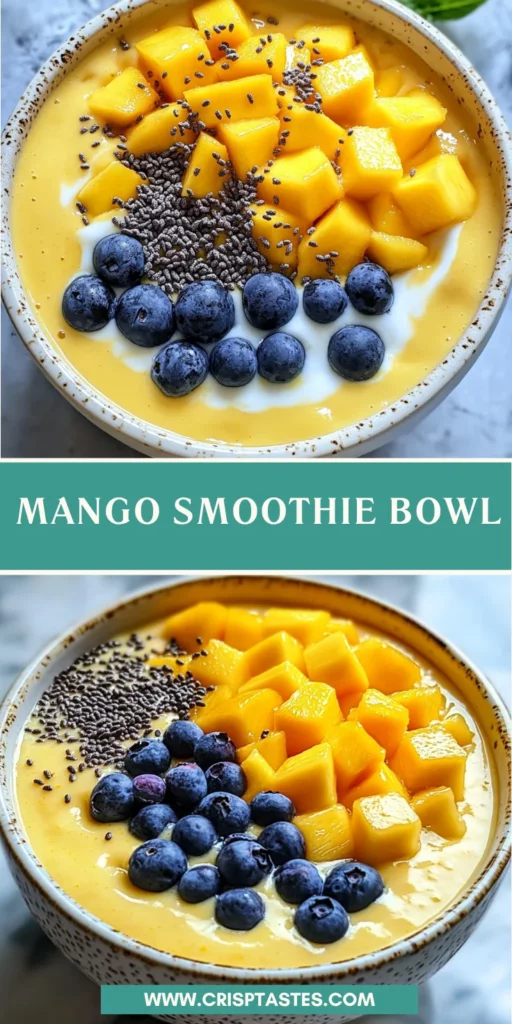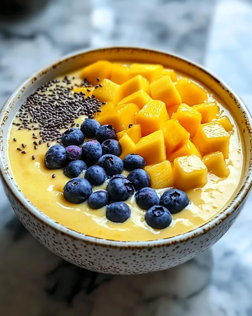 A refreshing and nutritious mango smoothie bowl, perfect for a healthy breakfast or snack.