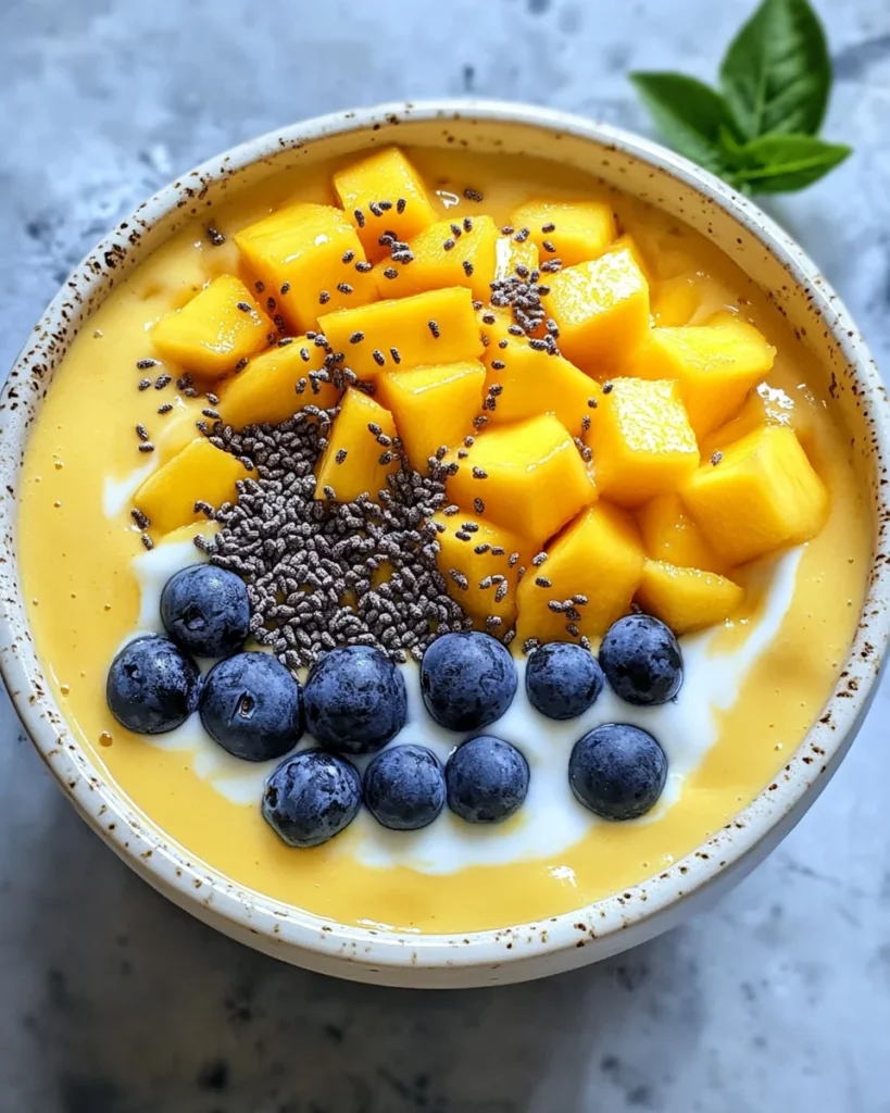 Here comes the fun part—toppings! Customize your Mango Smoothie Bowl with goodies like granola, fresh fruit slices, nuts, or seeds. Get creative! Scatter a handful of blueberries for a pop of color, or sprinkle chia seeds for added crunch. The possibilities are endless, and the best part is that each bowl can be a unique masterpiece!