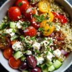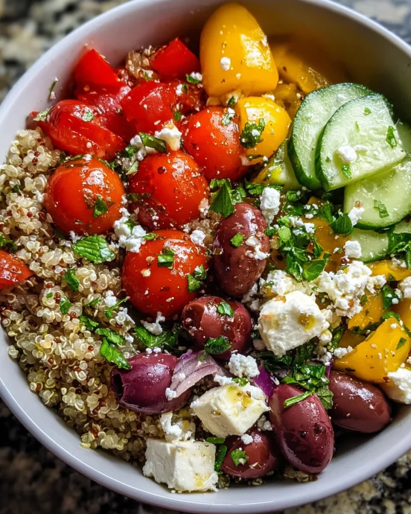 A refreshing and nutritious Mediterranean-inspired quinoa bowl topped with fresh vegetables, feta cheese, and a zesty lemon-herb dressing.