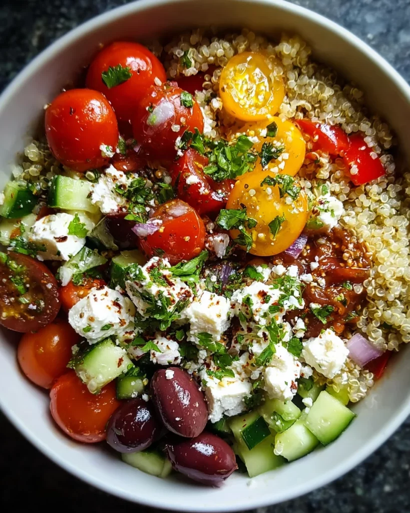 A refreshing and nutritious Mediterranean-inspired quinoa bowl topped with fresh vegetables, feta cheese, and a zesty lemon-herb dressing.