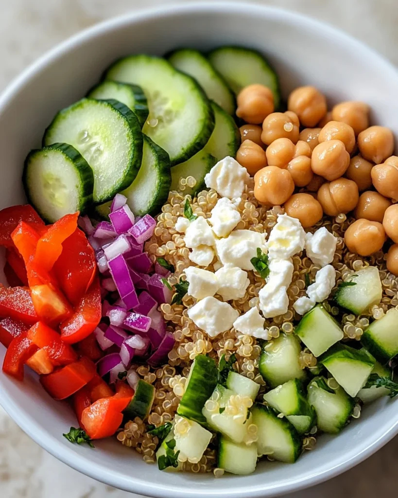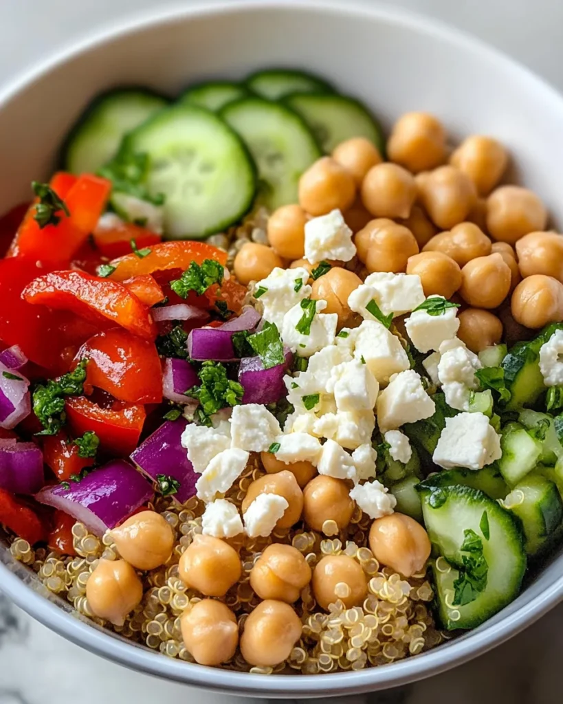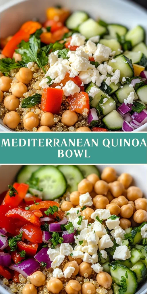 A delicious and healthy Mediterranean-inspired quinoa bowl packed with protein and fresh vegetables.