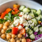- In a large bowl, combine cooked quinoa, chickpeas, cucumber, bell pepper, and feta.