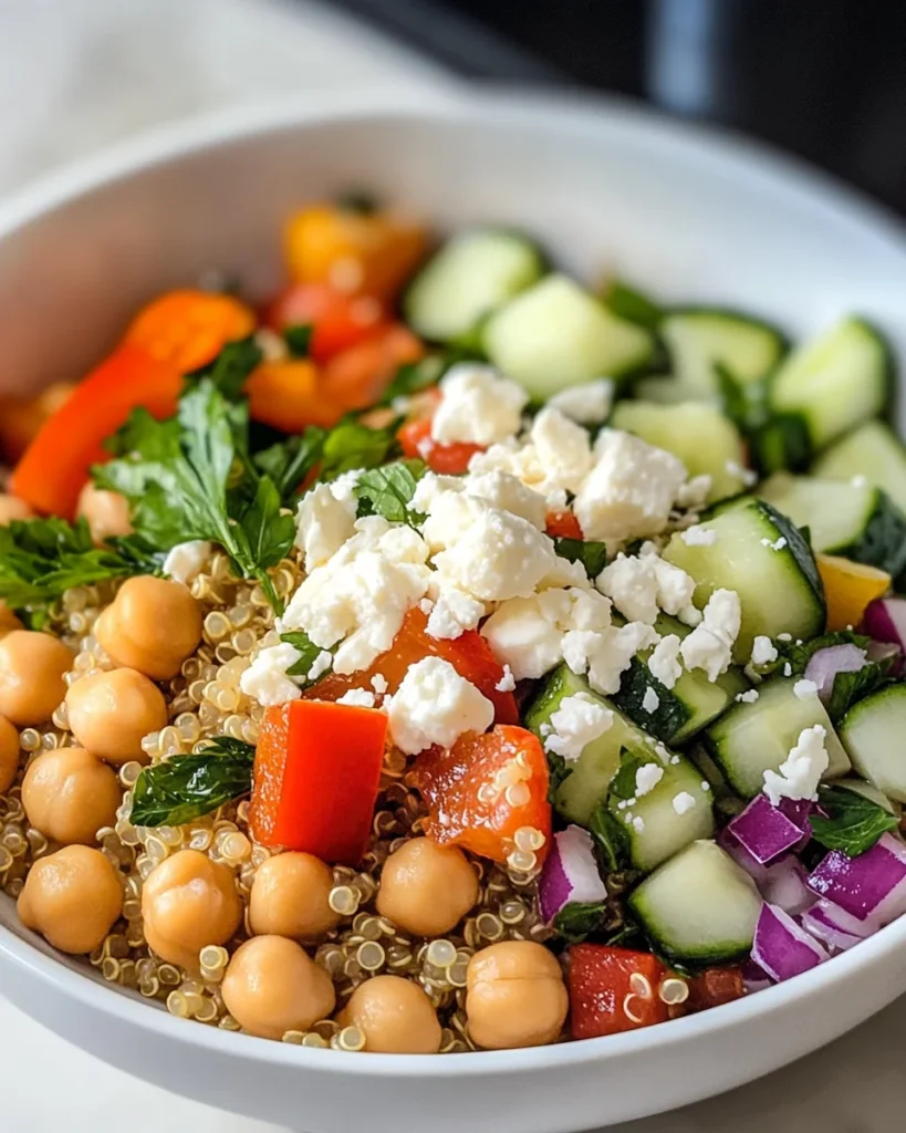 A delicious and healthy Mediterranean-inspired quinoa bowl packed with protein and fresh vegetables.