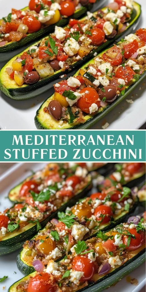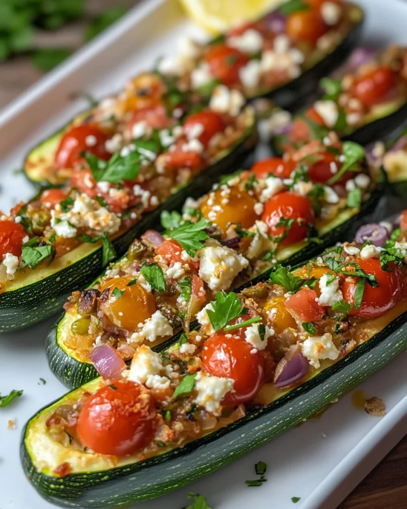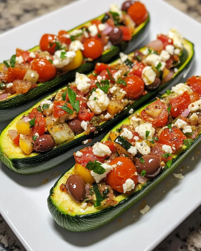 A vibrant and flavorful dish featuring zucchini stuffed with a medley of feta cheese, olives, and tomatoes, embodying the essence of Mediterranean cuisine.