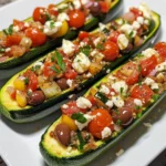 A vibrant and flavorful dish featuring zucchini stuffed with a medley of feta cheese, olives, and tomatoes, embodying the essence of Mediterranean cuisine.