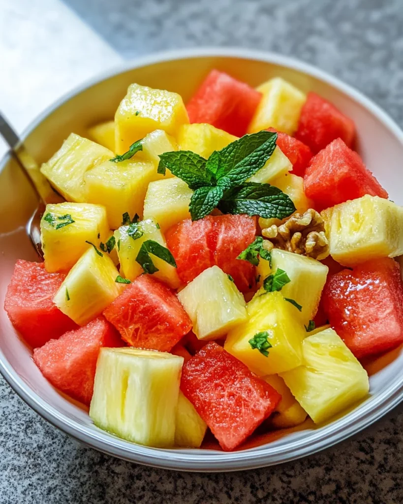 A refreshing and vibrant salad made with a mix of melons and pineapple, drizzled with a honey lime dressing and topped with walnuts and mint.