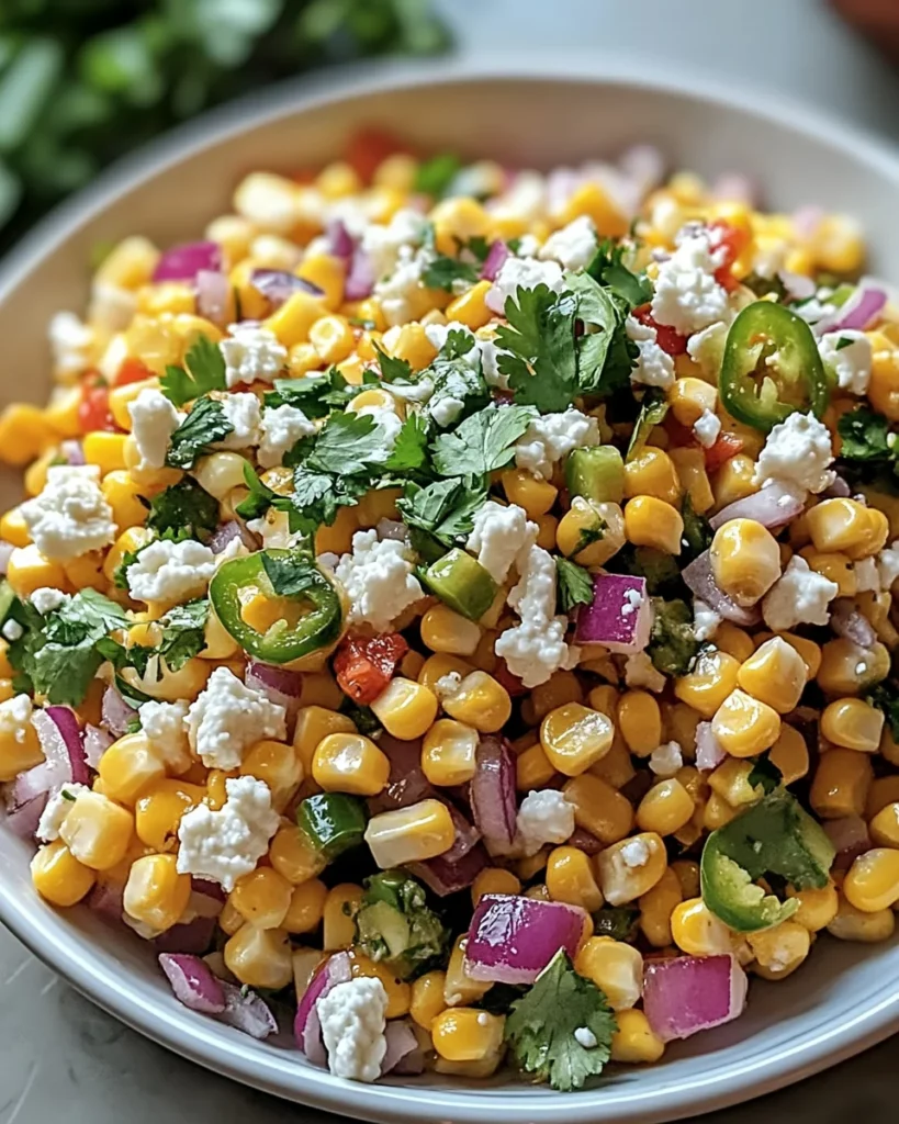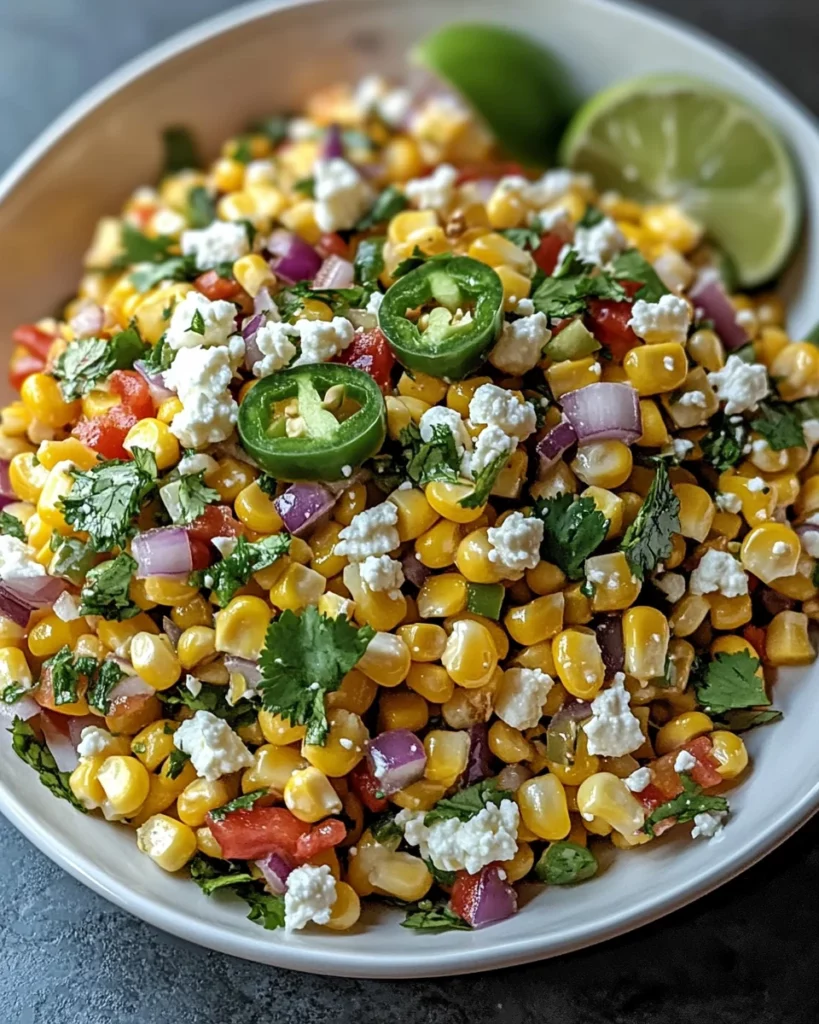 Mexican Street Corn Salad is a vibrant and flavorful salad featuring fresh corn, diced vegetables, and a creamy dressing, perfect for summer gatherings.