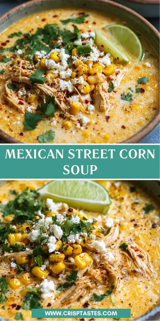 Making this Mexican Street Corn Soup is more than just cooking a meal; it’s about creating joyful moments with your loved ones. The comforting blend of flavors warms the soul and brings a smile to everyone’s face. Each bite is a celebration of rich spices, sweet corn, and tender chicken, all coming together in harmony. I hope you find as much joy in preparing and enjoying this soup as I do. It’s a wonderful dish that whispers warmth in every spoonful, making it perfect for those busy weeknights or cozy family dinners. Happy cooking!
