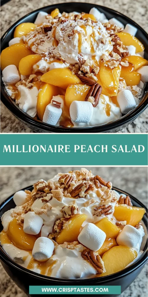 Making this millionaire peach salad is like capturing a slice of summer in a bowl. The joy of combining ripe peaches with creamy dressing and crunchy nuts is truly delightful. Each bite is a reminder of sunny days and family gatherings. Whether you’re serving it at a picnic or enjoying it as a quick snack, this salad brings smiles all around. I hope you find as much happiness in preparing and sharing this dish as I do. So, gather your ingredients, and let the flavors of this refreshing salad brighten your day!