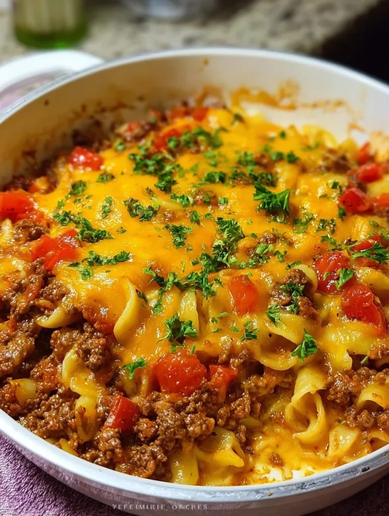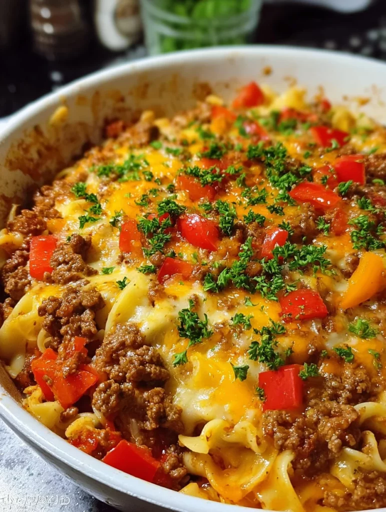Missouri Casserole is a comforting family dinner dish, layered with ground beef, pasta, and cheeses, baked to perfection.