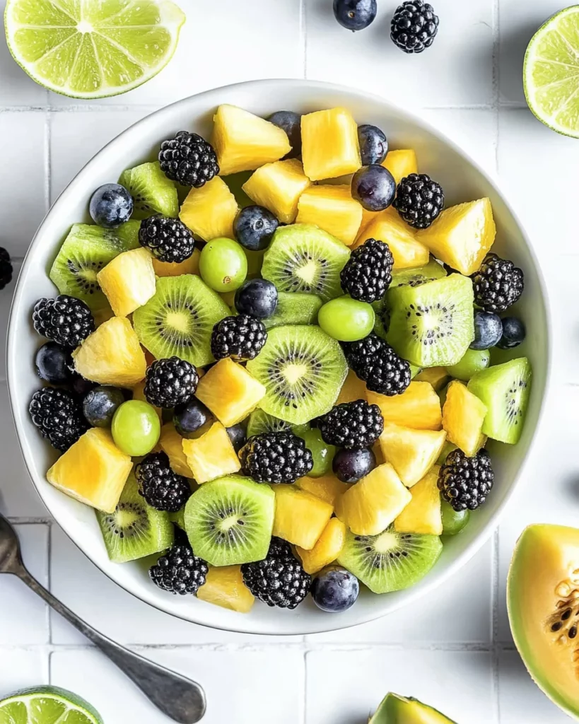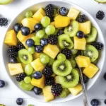 Now, take a large bowl and throw in all those fabulous chopped fruits. Pineapple, kiwis, honeydew, grapes, blueberries, and blackberries—all together in one bowl! The colors and textures look so inviting. It’s like a fruit party waiting to happen!