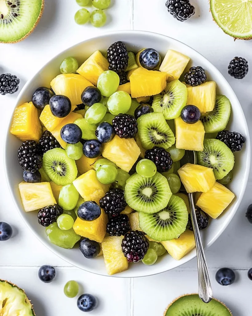 Now, take a large bowl and throw in all those fabulous chopped fruits. Pineapple, kiwis, honeydew, grapes, blueberries, and blackberries—all together in one bowl! The colors and textures look so inviting. It’s like a fruit party waiting to happen!
