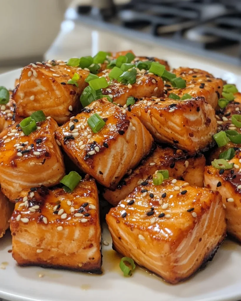 Keywords: honey garlic salmon, crispy salmon bites, salmon appetizer, healthy salmon recipe, soy glaze fish