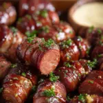 A flavorful appetizer featuring Kielbasa bites with a zesty mustard sauce, perfect for parties or gatherings.