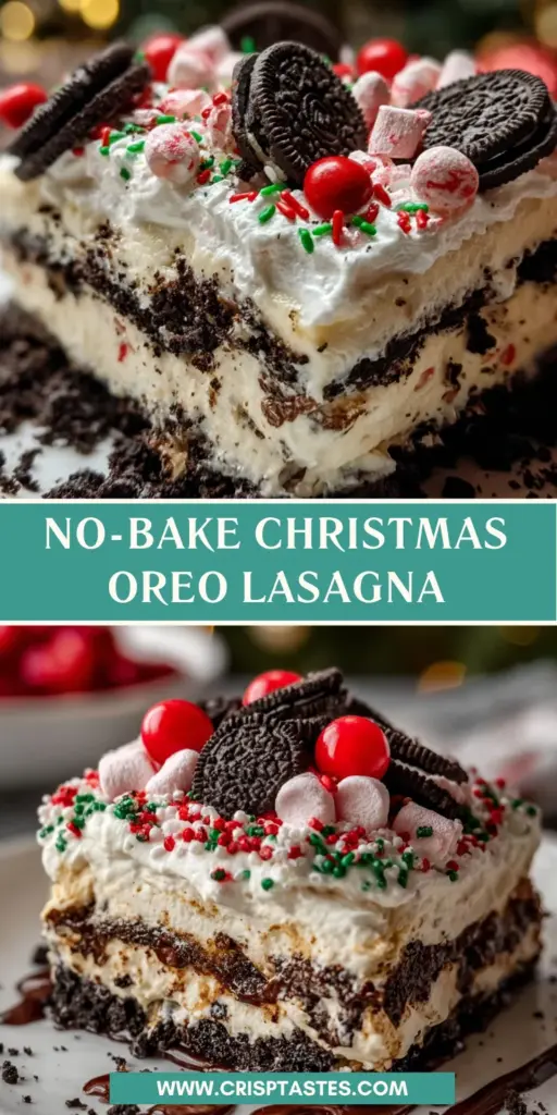 A festive and delicious no-bake lasagna made with layers of Oreo cookies, cream cheese, vanilla pudding, and whipped cream, perfect for Christmas celebrations.