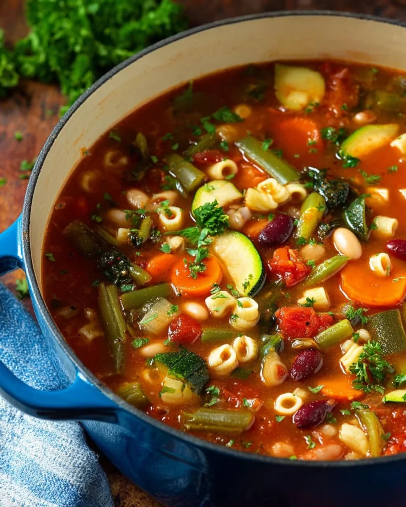 A delicious and hearty Olive Garden Minestrone Soup recipe that is easy to make and packed with vegetables and beans.