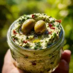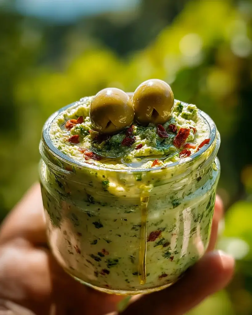 Once your dip is perfectly mixed, it’s time to transfer it to a beautiful serving bowl or jar. Top it off with a handful of whole green olives for decoration and a drizzle of olive oil to create an appetizing finish. Not only does this look stunning, but it also adds a touch of extra richness!