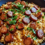 Return the browned sausage to the skillet, gently nestling it into the mixture of rice and liquid. This ensures even cooking and that every delicious piece gets to mingle in the festivities. It’s all about teamwork in this one-pan wonder!