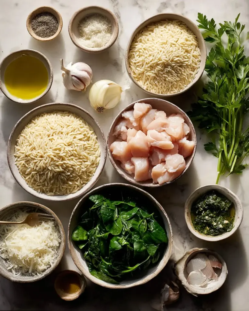 To whip up this scrumptious One-Pot Chicken and Spinach Orzo, you’ll need a handful of fresh and flavorful ingredients. Here’s a quick rundown: