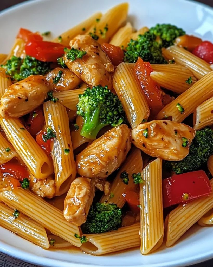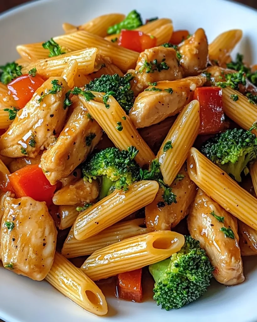 A delicious and quick one-pot meal featuring tender chicken, pasta, and colorful vegetables coated in a spicy honey garlic sauce.