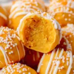 Delicious orange-flavored truffles made with orange cake mix and cream cheese, coated in candy melts and drizzled with white almond bark.
