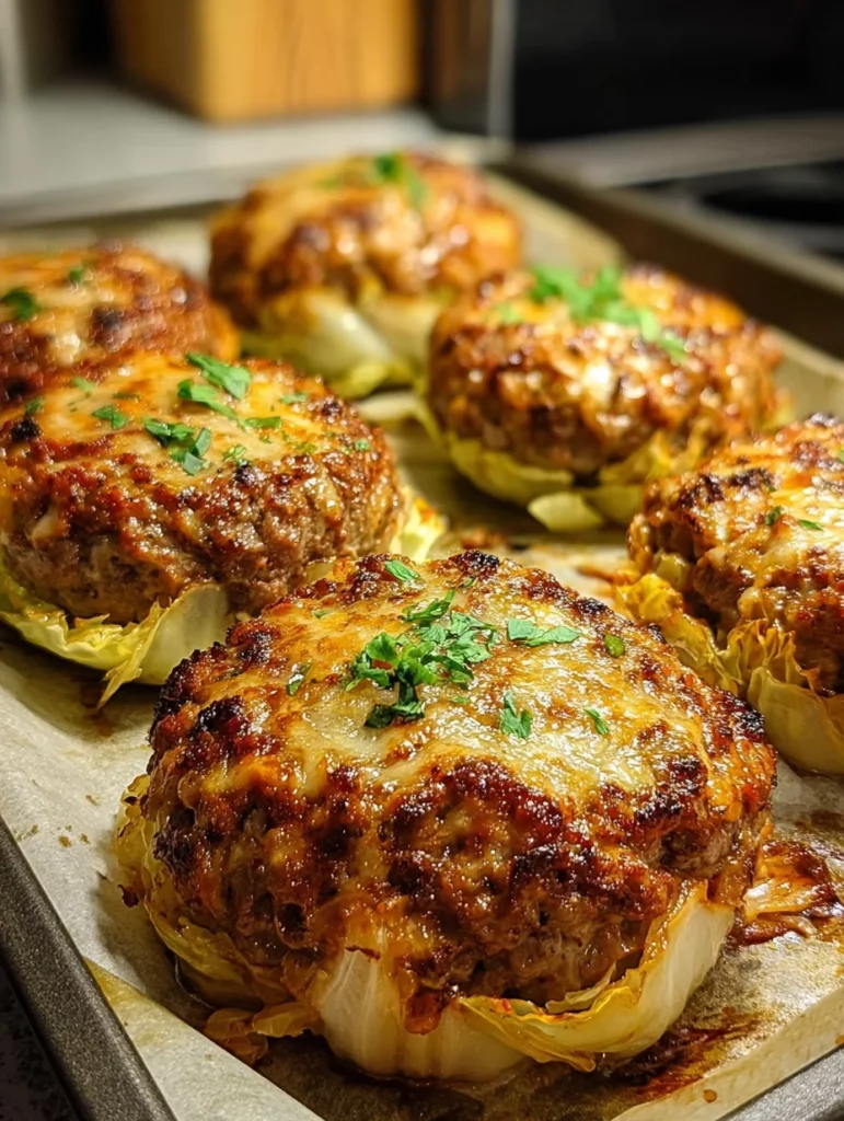 A delicious and healthy alternative to traditional burgers, made with cabbage slices and a savory meat mixture.