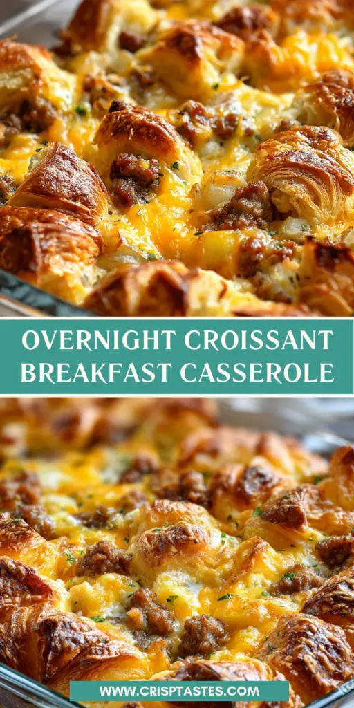 A delicious Overnight Croissant Breakfast Casserole featuring buttery croissants, sausage, and cheese, baked to perfection.
