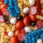 A vibrant and festive pasta salad perfect for patriotic celebrations, featuring colorful pasta, fresh vegetables, and flavorful dressings.