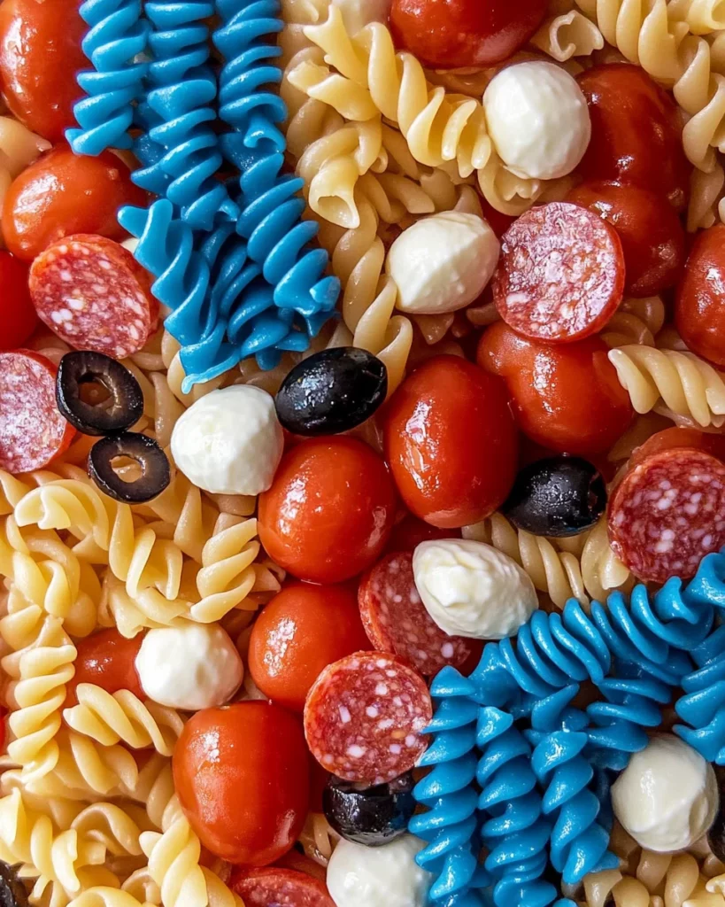 A vibrant and festive pasta salad perfect for patriotic celebrations, featuring colorful pasta, fresh vegetables, and flavorful dressings.