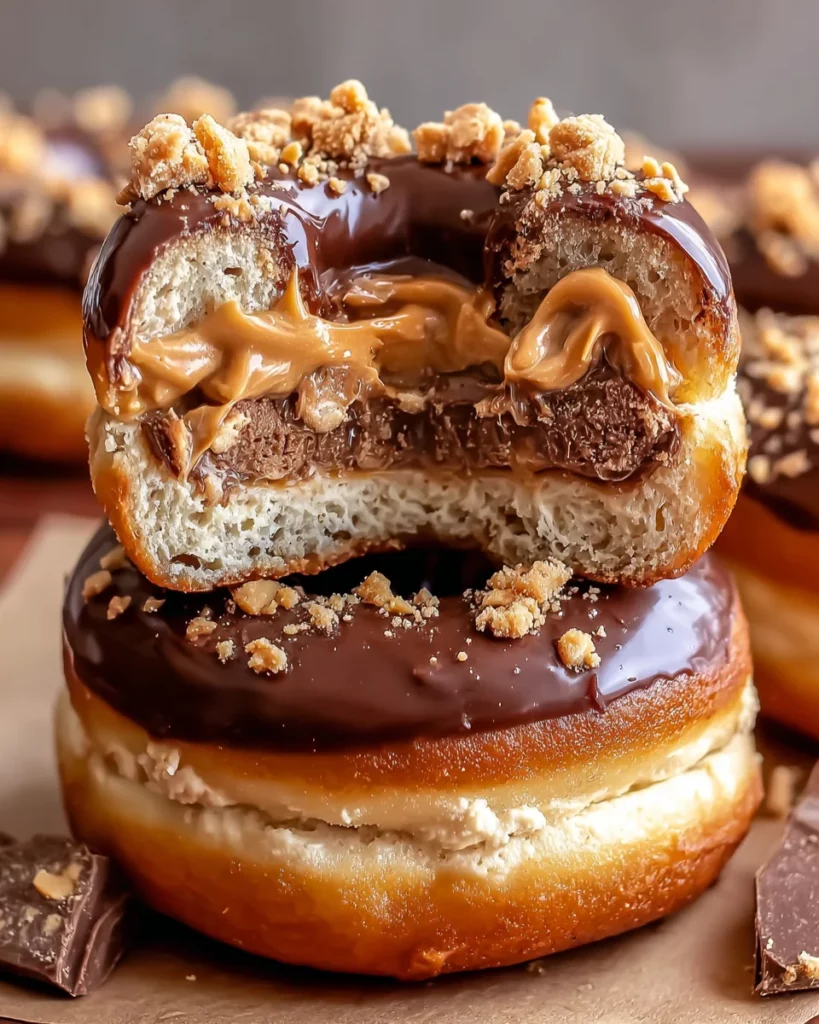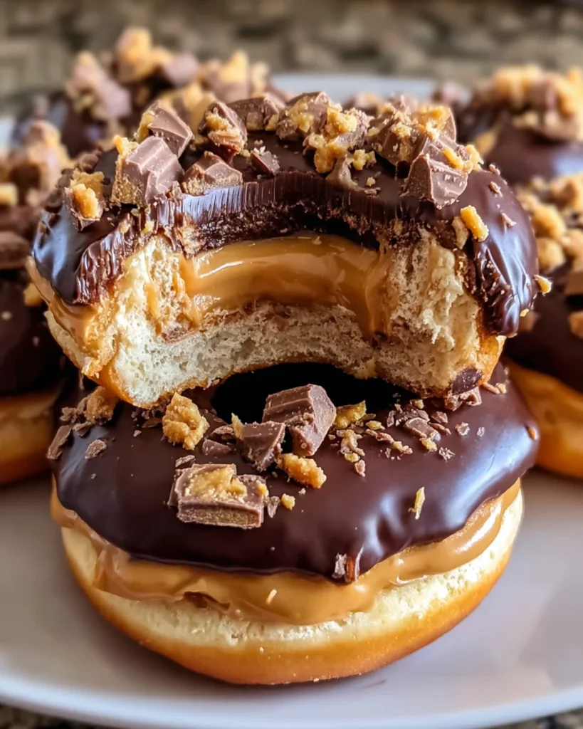 - Drizzle the warm peanut butter mixture over the assembled donut sandwiches. Garnish with additional crushed peanut butter cups if desired. Serve immediately.